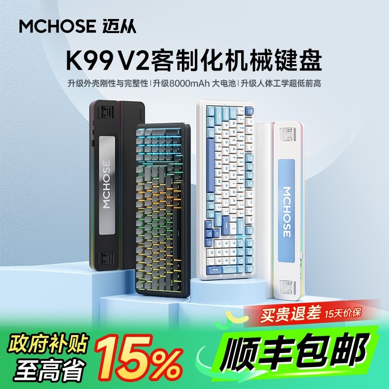 天猫商城迈从K99 99键2.4G蓝牙多模无线机械键盘正在促销,原价449元,使用国家补贴8.5折起(减52.35元),最终到手价仅296.65元/件。这款键盘共有风信子轴、星黛紫轴、琉光冰淇淋轴、夜莹轴四种轴体可选,除夜莹轴外均为线性轴体,卫星轴出厂京润无钢丝音。配色有天际橙、碧光绿、晴空蓝以及冰川渐层四种。不过轴体和配色是绑定的,选择度较低。键帽有MDA和OEM侧刻两种高度,MDA键帽表面圆润、字符不透光,OEM侧刻键帽内层透明、字符透光。键盘个性化背板配重有阳极氧化和PVD镜面可选,PVD镜面高端大气但需小心刮花。它采用GASKET结构设计,内部六层消音填充,杜绝空腔音,开槽PCB设计手感软弹、一致性好。定位板有PC和FR4双面沉金可选,PC定位板声音小、打字舒适、表现偏闷,FR4定位板声音集中响脆。键盘后侧新增环绕式RGB灯带,可调多种灯效模式。采用凯华轴座,支持全键热插拔,可DIY键帽和轴体。支持有线、2.4G无线、蓝牙三模连接,6000mAh锂电池续航无忧,支持1000Hz回报率。喜欢就别错过!