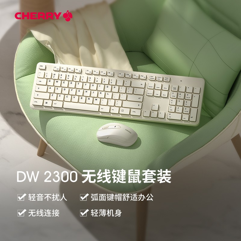 CHERRY DW2300无线键鼠套装是CHERRY 2022年推出的全新办公外设,主打无线低延迟与轻音静享体验,特别适合追求高效与安静工作环境的用户。该套装采用先进的2.4G无线技术,仅需一个接收器即可同时连接键盘和鼠标,连接稳定响应迅速。键盘采用经典巧克力按键设计,键帽经过弧面与圆边处理,贴合手指曲线,打字手感舒适流畅,配备全尺寸布局及8个可自定义功能快捷键,提升操作效率。鼠标轻量化设计,不含电池仅重70g,握感轻盈操控灵活。键盘与鼠标均采用轻音按键结构,有效降低敲击噪音,办公更专注不扰人。整套设备功耗低,续航持久,满足长时间使用需求。