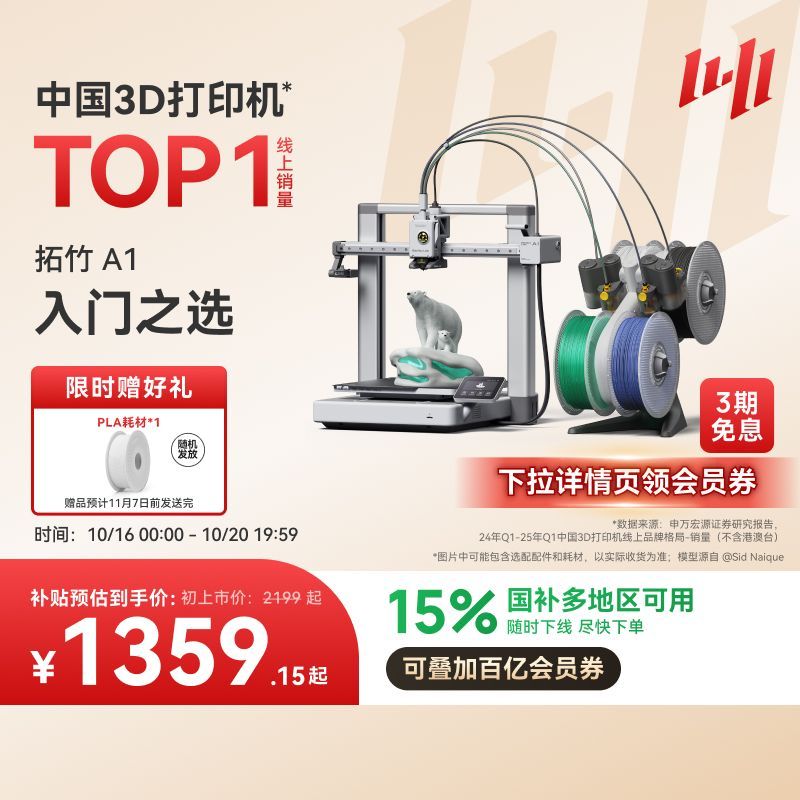 Bambu Lab拓竹A1 3D打印机全新上市,搭载智能自动调平与高速FDM技术,操作简单精准校准,轻松实现多色打印,满足家用及创意设计需求,大尺寸打印空间让创作更自由。