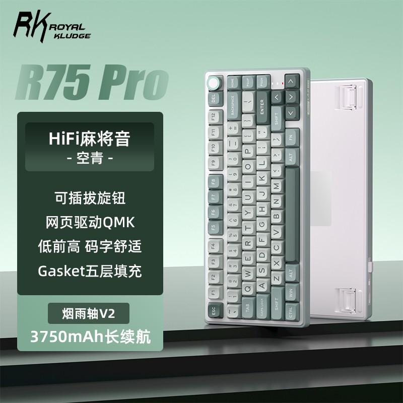 天猫精选的ROYAL KLUDGE R75 81键 2.4G蓝牙多模无线机械键盘正在进行优惠活动。这款RK R75系列机械键盘有白色、黑色、奶芋、魅影、轻风五个配色,轴体选择丰富,有青轴、茶轴、K紫轴Pro段落轴,K银轴Pro、雪黄轴、烟雨轴、TTC钢铁轴可选。它统一配置了全系PORON夹心棉、iⅸpe轴下垫、消音减震棉、开模底部硅胶,还有PC定位板开槽、CNC铝合金一体成型旋钮、板簧Gasket结构以及全键轴座插拔。