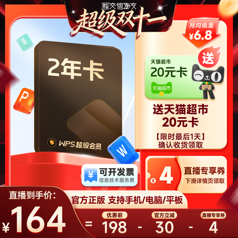 金山软件WPS超级会员2年卡现推出超值优惠,原价198元,现活动售价仅198元,参与满1件打9.5折并立减30元,实际到手价低至159.6元,88VIP用户下单更享专属福利。本卡为WPS超级会员2年使用权限,畅享文档、表格、演示、云存储等全功能服务,全面覆盖办公所需,同时额外赠送AI会员权益,智能排版、语音转写、AI生成内容等功能随心使用,大幅提升办公效率。无论是学生、职场人士还是自由职业者,都能通过WPS超级会员实现高效创作与无缝协作,此次促销力度大,机会难得,抓紧入手,享受长久安心的优质办公体验。