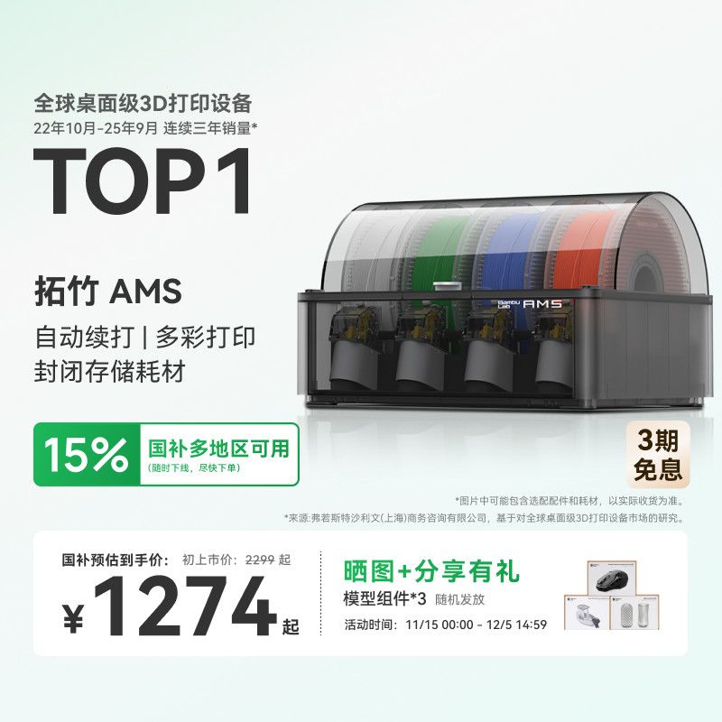 Bambu Lab 拓竹 3D打印机AMS自动供料系统智能自动换料支持多色打印X1/P1通用,现正参与拼多多百亿补贴大促,原价1498元,限时直降150元,最终到手价仅需1348元!这款AMS自动供料系统专为追求高效与品质的3D打印爱好者设计,支持智能自动换料功能,实现无缝切换多种耗材,轻松完成多色打印任务,大幅提升创作自由度与打印效率。结构精密运行稳定,兼容X1及P1系列机型,安装简便操作智能,无论是复杂模型还是批量生产都能从容应对。高品质组件确保长时间运行的可靠性,是专业用户和发烧友的理想之选。机会难得,性价比爆棚,喜欢的朋友抓紧入手!