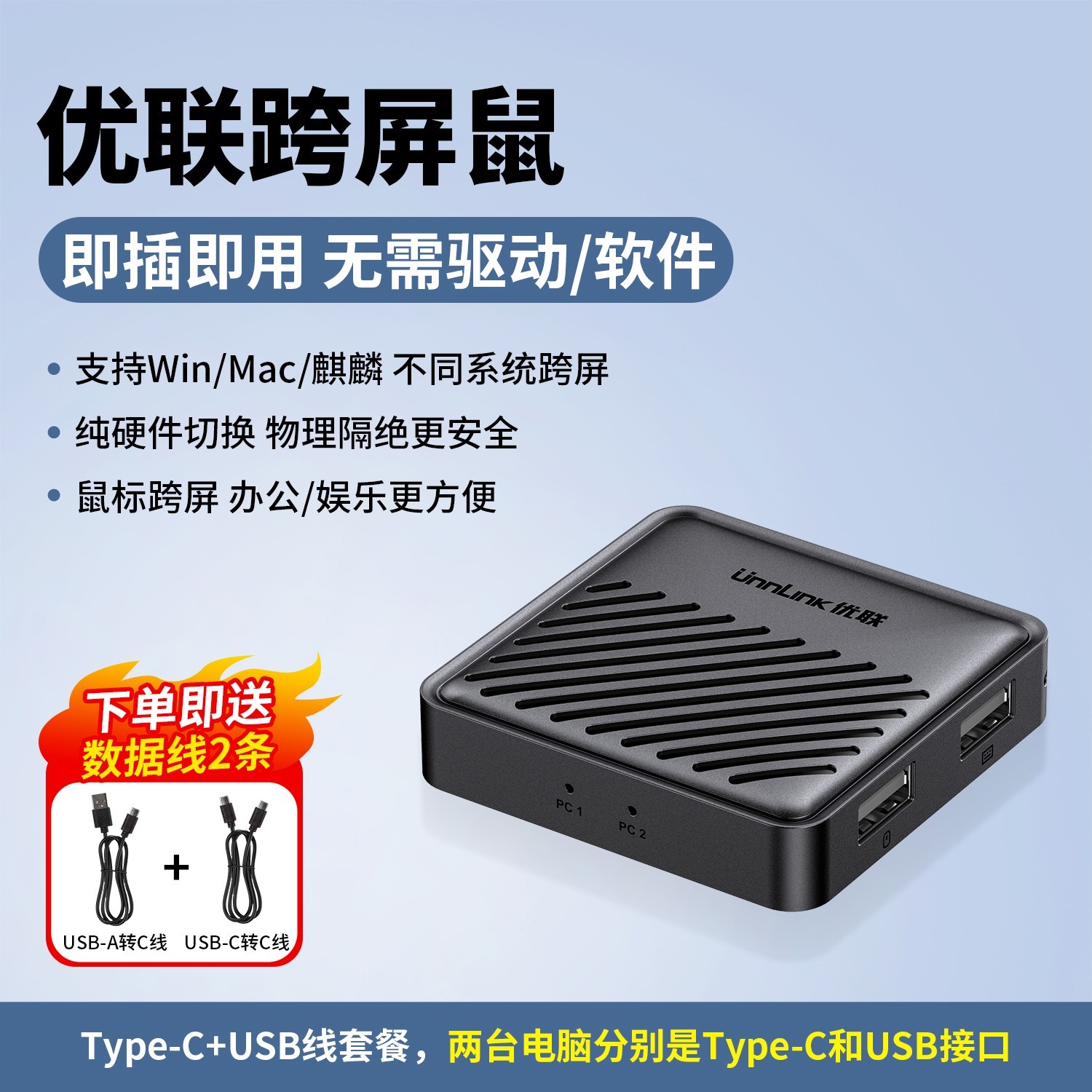 优联跨屏鼠是一款高效便捷的键鼠共享器,支持两台电脑共用一套鼠标键盘,实现跨屏操作、穿屏传输,大幅提升办公效率,特别适合炒股、多设备办公、笔记本与台式机之间快速切换使用,无需安装驱动即插即用,兼容性强,连接稳定流畅。