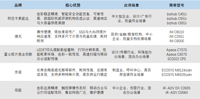 大型企业办公场景:此类场景日均印量大、多用户共享使用,需求聚焦高输出速度、大容量供纸、稳定的连续作业能力,同时需具备智能安全管理、云服务集成等功能,满足多部门协同办公与数据保密需求。