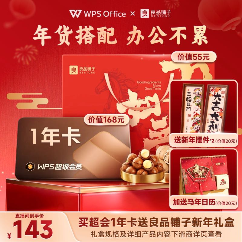 金山软件超级会员2年卡限时特惠,原价198元,现参与立减60元活动,下单1件仅需138元即可入手,超值升级办公与安全体验;开通后畅享WPS全功能、1TB云空间、PDF高级工具、PC/手机/平板多端同步等专属权益,更额外赠送良品铺子精选坚果礼盒、精美新年摆件及实用台历,办公娱乐两不误,新年好礼提前备齐!